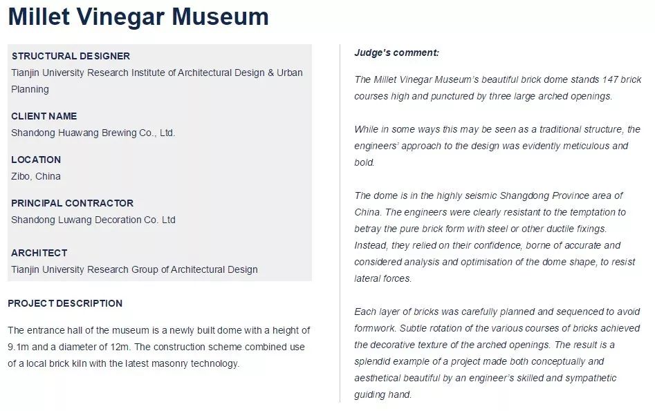 小米醋博物馆结构设计入围2019世界结构大奖近日,世界结构大奖Structural Awards公布入围名单,天大设计总院作品:小米醋博物馆(Millet Vinegar Museum)凭借“硬核”的结构设计成功入围,这是继今年该项目建筑设计入围美国英国德国和西班牙四个国家大奖后,结构设计再传佳讯。 ![]() Structural Awards2019 世界结构大奖 从1968年开始,The Structural Awards 对全球范围内的基础设施以及建筑项目的结构设计进行表彰,挑选出卓越的兼具创意、美感、可持续性和价值的项目。 大奖由结构工程师协会(Institution of Structural Engineers)组织发起,50多年的历史里,包括悉尼歌剧院、法国巴黎蓬皮杜中心、英国威尔士塞文桥等伟大的结构设计都曾经获得相应的结构奖项。 ![]() ![]() 评委会点评词: 小米醋博物馆美丽的砖穹顶高147层砖,被三个巨大拱形开口刺穿。 虽然在某些方面这可能被视为传统结构,但工程师的设计方法显然是细致和大胆的。 穹顶位于中国山东省地震高发地区。工程师们显然抵制住了背叛纯砖形式的诱惑,没有采用钢或其他延性加固件。相反,他们依靠信心,通过对穹顶形状精确、仔细的分析和优化,来抵抗侧向力。 每层砖都经过精心规划和排序,以避免使用模板。每层砖的细微旋转,使拱形开口具有装饰性纹理。这是一个由工程师富有技能和情怀的双手指导设计的兼具概念与美感的项目的极好例子。 ![]() 小米醋博物馆位于中国山东省淄博市周村区王村镇,是在一个王村酿造厂厂区基础上进行改扩建而成。此次入围结构大奖的是博物馆入口的砖穹顶结构。 项目名称:小米醋博物馆(Millet Vinegar Museum) 建设地点: 山东省淄博市 结构团队:孟祥良,孙峣,王磊,丁永君,安海玉 完成时间:2018年 建筑面积:835.65平方米 小米醋博物馆 ![]() 穹顶结构入口 历史悠久的的醋文化和古朴的器皿给予了设计者最初的设计灵感,穹顶结构的外形与醋坛子相似,并且阳光透过穹顶顶部天窗照入室内,投射出醋坛子形状的影子,影子的形状也随着时间不断变化。设计者选择了当地生产的耐火砖作为穹顶结构的材料,在当地,耐火砖的生产和砌筑工艺已经十分成熟,且砖窑结构也普遍采用了穹顶形式。他们将穹顶的设计方案与当地砖窑相结合,并对砌筑工艺进行了改良,使其造型更为美观。 醋坛子 ![]() 穹顶概念图 ![]() 醋坛子形状的投影 设计者通过对穹顶计算模型在静力和地震作用下的内力分析,不断优化穹顶的形状,使其受力最合理,并最终确定为穹顶结构形状。穹顶结构高度为9.1m,底部直径为12m,顶部直径为4m,并在底部设置三处拱形门洞,跨度分别为3.0m、4.7m和5.3m。 方案确定后,设计者在软件中建立了精确施工模型,并编写了相应程序从而计算出每层砖的高度、半径、砖数以及每块砖的水平倾角、转角。 ![]() (a)静力作用 ![]() (b)X向地震作用 (c)Y向地震作用 ![]() MIDAS模型-砖排布规则 在穹顶的混凝土基础完成后,首先施工的是三处拱形门洞。拱门处耐火砖为楔形砖,尺寸分别为230×230×65(55)和230×115×65(55)。拱门的宽度为3皮砖(两块大砖,一块小砖),以避免形成通缝。 ![]() ![]() 拱门施工 穹顶主体结构共147层耐火砖,每块砖尺寸均为230mm×115mm×65mm。最底层砖数为195块,厚度为460mm(两皮砖),砖水平倾角为0度,砖长边方向为圆的径向。随着层数的增加,每层砖的数量不断减小,砖水平倾角不断增大,砖长边方向也不断旋转,但厚度始终为两皮砖。到最顶层时,砖数为51块,砖水平倾角为55度,砖长边方向为圆的法向,厚度为230mm(两皮砖)。 整个结构中,砖缝砂浆的厚度最小为3mm,最大为20mm,并保证砂浆饱满。上下相邻的两层砖均错位放置,而且每隔若干层,设置一层“不旋转层”(砖水平倾角继续增大,但砖长边方向均指向圆心),这样不仅能防止在砖数和角度不断变化的情况下形成竖向通缝,也让立面有了层次感,效果更加美观。 ![]() ![]() ![]() ![]() 穹顶施工 根据设计者提供的施工模型结果,施工人员在每层砖施工之前,会先在场外进行摆放,确认无误后再正式施工。在每层砖施工完成后,施工人员会对各项数据进行检查和测量,将结果与设计者进行沟通,保证其误差满足要求,并在下层施工时进行误差修正。 穹顶主体结构完成后,在穹顶顶部设置了钢筋混凝土圈梁,并砌筑了1.7m高的圆筒,在顶部设置玻璃天窗。施工过程中,除了拱门砌筑时使用了木模板外,主体结构的施工没有采用任何模板。整个地上穹顶结构的施工花费了五个月的时间。 ![]() ![]() ![]() ![]() 砖排布细节 ![]() 穹顶完成后