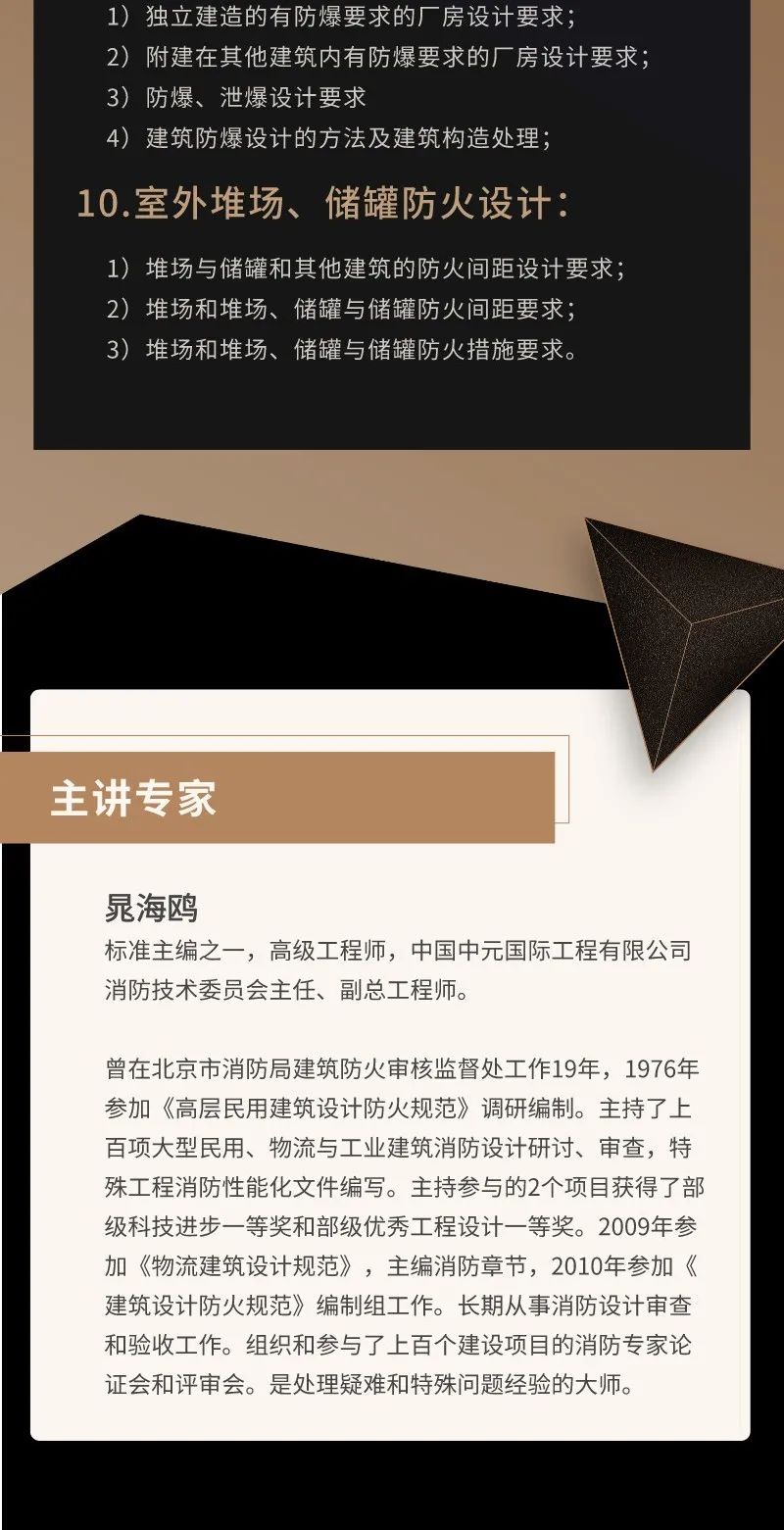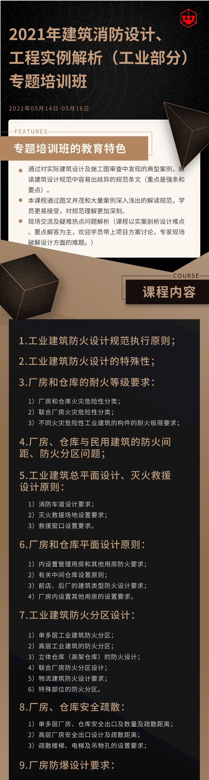 培训 | 关于举办“2021年建筑消防设计、工程实例解析(工业部分) 专题培训班”的通知关于举办“2021年建筑消防设计、 工程实例解析(工业部分) 专题培训班”的通知 随着中国房地产、建筑业的迅速发展,建筑设计越来越复杂,尤其是近年来发生的建筑爆炸与火灾事故也越来越多,如:2014年“8.2”昆山中荣金属制品厂粉尘爆炸,2015年天津港“8·12”瑞海危险品仓库特别重大爆炸火灾等,使得设计人员面临的问题和压力越来越大。消防局对建筑施工图的消防设计与技术审查要求越来越严格。 住房和城乡建设部公布的《建设工程消防设计审查验收管理暂行规定》自2020年6月1日施行,该《规定》明确了建设单位依法对建设工程消防设计、施工质量负首要责任。建设工程的施工图审查已全面推行“多审合一”。今年改革又提出逐步取消或缩小施工图审查范围。“多审合一”后的建筑消防设计和施工图消防审查面临哪些新情况、新问题、新挑战? 为帮助建筑设计人员和施工图审查人员尽快熟悉了解新情况,解决新问题,迎接新挑战,确保消防设计和审查质量,我单位拟举办工业与民用建筑设计和施工图审查人员研讨班。通过对实际建筑设计及施工图审查中发现的典型案例,解读建筑设计规范中容易出歧异的规范条文(重点是强条和要点)。为了让大家更好的了解建筑设计防火类规范的强制性条文。本课程通过图文并茂和大量案例深入浅出的解读规范,学员更易接受,对规范理解更加深刻。现场交流及疑难热点问题解析(课程以实案剖析设计难点、要点解答为主,欢迎学员带上项目方案讨论,专家现场破解设计方面的难题。)